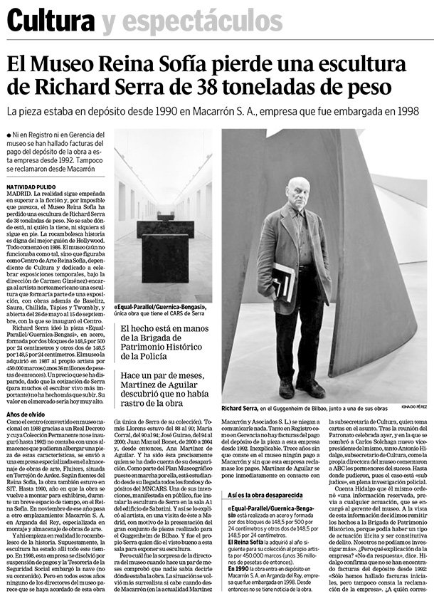 La misteriosa desaparición, como la propia escultura, queda elevada también a categoría de obra maestra. Como el escándalo adquiere resonancia mundial, Serra acepta replicar la pieza y darle rango de original, y el Reina Sofía, sumarla a su exposición permanente.