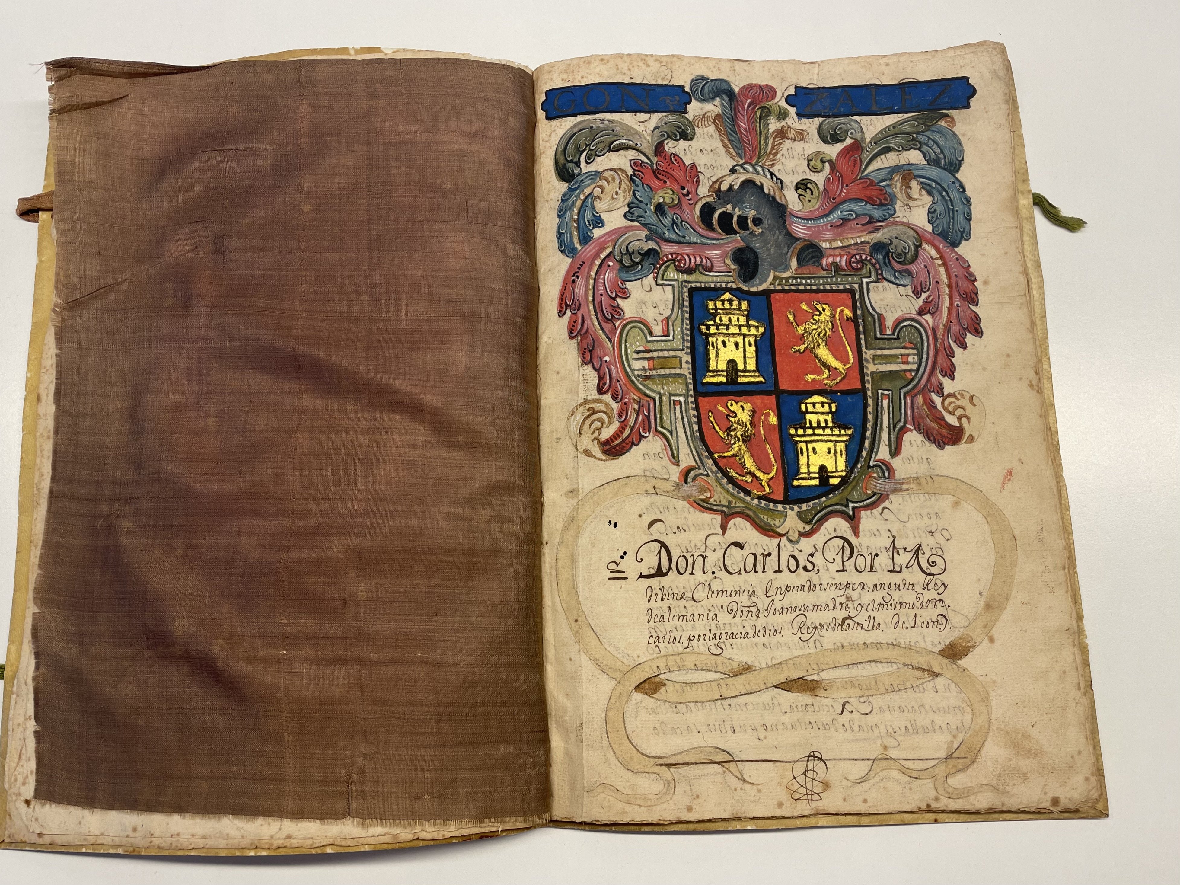 Del conjunto del manuscrito es especialmente destacable el escudo de armas de la familia González, manteniendo la guarda de seda que protege la portada, tal y como se puede ver en la fotografía.