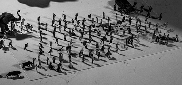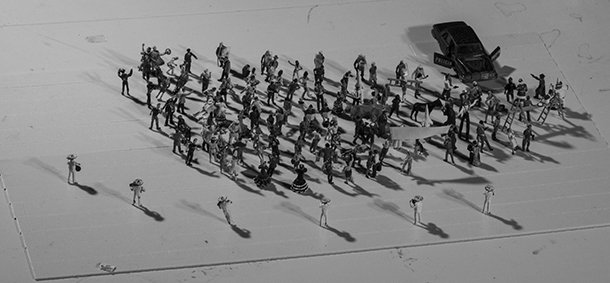 El actor se sirve de sus manos para ir situando las miniaturas en escena y se acompaña una evocadora banda sonada interpretada, desde lo alto de dos pequeños altavoces a ambos lados del diminuto gran escenario, por diminutos músicos; la sección eléctrica a la izquierda de los espectadores, la clásica a la derecha. Y a partir de ese instante comienza el desfile de personajes el forzudo y el equilibrista, el circo, el matrimonio que ve su familia crecer, la fiesta -las tradiciones-, el dinero, la ciudad, accidentes, fotógrafos y cámaras que todo lo inmortalizan, el hombre poderoso -más que un gobernante, quizá-, islas de arroz, naves espaciales patrocinadas que se estrellan, helicópteros accionados por secador de pelo, el sexo en modo orgía sobre pandereta que vibra hasta llegar al éxtasis y la muerte, siempre rondando, siempre presente. La vida, en definitiva y un final no muy optimista.