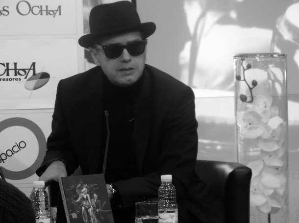 Informado, espero al músico. Juan Perro –Santiago Auserón- sube las escaleras enfundado en un abrigo negro, cubierto por un fedora negro y detrás de unas rayban, por supuesto, también negras. “Un saludo para los amigos de Logroño –regala nada más llegar a la sala donde tiene lugar la presentación-, que no pase mucho tiempo sin regresar a esta ciudad”.