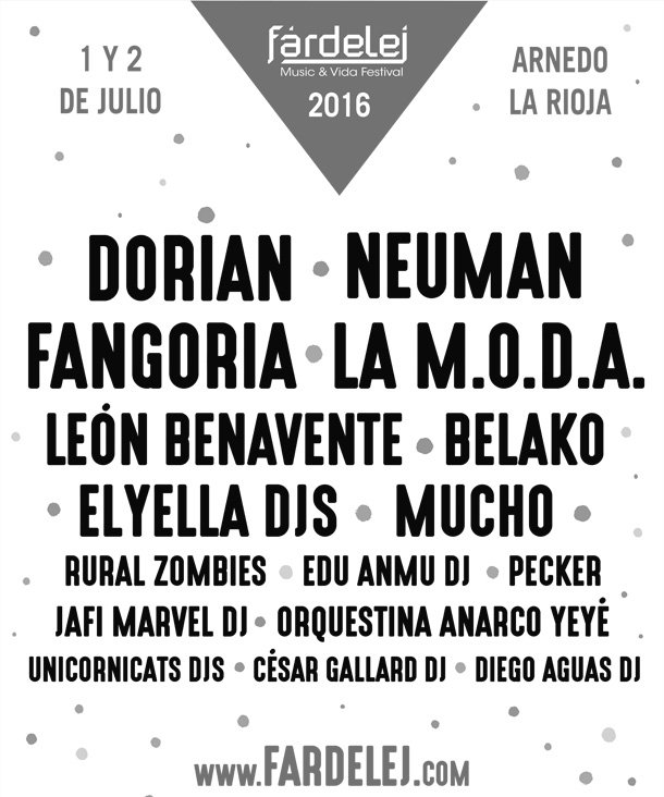 A través de la gran cristalera situada a pie de calle del Instituto de la Juventud de La Rioja la ciudad se muestra dinámica y efervescente; desde la propia calle –al otro lado del ventanal y bajo los soportales del Muro de la Mata- el interior del IRJ surge expectante. El cartel del Festival Fárdelej es el protagonista y anuncia un plantel de lujo. Por el Arnedo Arena -y por los otros tres escenarios del certamen- pasaran Dorian, Fangoria, La M.O.D.A, Neuman y León Benavente; Belako, Mucho, Pecker, Rural Zombies y la Orquestina Anarco-Yeyé; así como de los DJs Elyella DJs, Edu Anmu DJ, Diego Aguas DJ, Unicornicats DJs y César Gallard DJ. Dieciséis conciertos que podrán disfrutarse los días 1 y de julio.