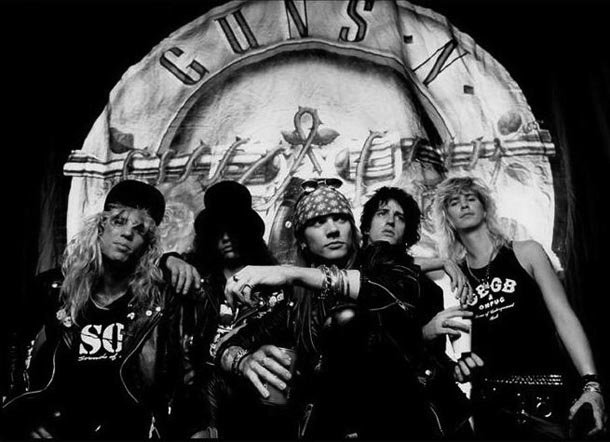 La historia es conocida, Axl Rose e Izzy Stradlin formaban parte de una banda llamada L.A. Guns, que tendría también su carrera, con Tracii Guns como guitarrista principal. Con el tiempo, se incorporarían a la misma por diferentes vías Slash Hudson (guitarra principal), Duff McKagan (bajo) y Steven Adler (batería), desapareciendo el propio Guns del grupo. Así, quedaba conformada la formación clásica de GNR en 1985, que se iría fogueando y ganando fama en los clubes de Los Ángeles como el Troubadour o el Roxy. La potencia de GNR era brutal, ofreciendo un salto más allá del rock imperante en los medios. Estaba claro que subían la apuesta, la influencia del rock más clásico y del punk era evidente. Pero también estaban empeñados en vivir la vida de forma muy rockera, y eso implicaba el consumo de todo tipo de sustancias y de cantidades ingentes de alcohol. Vamos, la del 'rock star' prototípica.