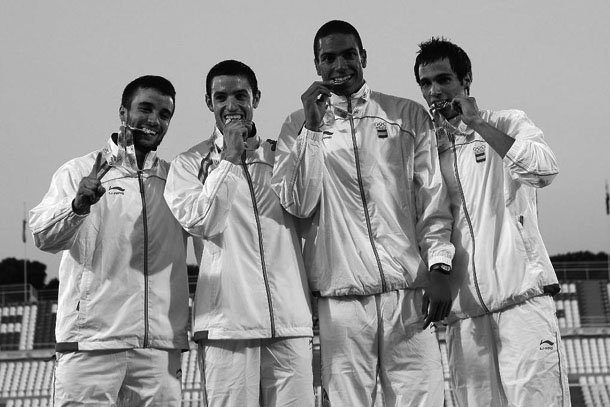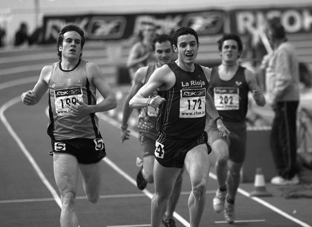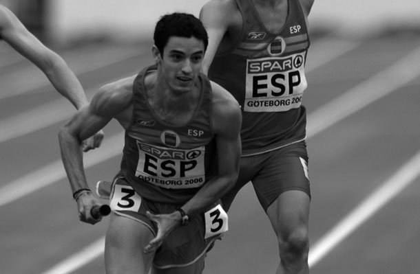 Santi Ezquerro está sufriendo una de las peores sensaciones que pueden acompañar a un atleta. Está lesionado. Primero fue la cadera cuando acababa de revalidar el título de campeón de España de 400 metros en pista cubierta y, ahora, cuando comenzaba a entrenar de nuevo, una dolorosa molestia en el talón de Aquiles. Santi ha sido 19 veces internacional y presenta unas marcas de 21’19’’ en los 200 metros y de 46’80’’ en los cuatrocientos, su prueba. Su distancia desde que su entrenadora la transmitió la pasión que ella sentía por la vuelta al anillo; quizá la prueba más agónica de todo el programa atlético. El entusiasmo y el ímpetu por el 400 ha llegado a asimilarlo de tal manera que en 2007, en los Campeonatos de España celebrados en San Sebastián, tratando de obtener la victoria se lanzó –se tiró literalmente- hacia la línea de meta. Fue segundo a dos centésimas del ganador y… se fracturó un brazo. “No Sentía dolor –recuerda- sólo rabia por haber sido segundo… bueno hasta que apoyé el brazo para levantarme”. Se resarciría con creces años después./Javi Muro.