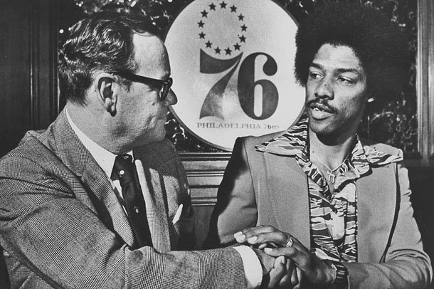 A finales de 1977, Erving no llega a un acuerdo de renovación con su equipo y es traspasado a los Philaladelphia 76ers. Desde el instante en que lanzó su primer tiro se convirtió en el líder de la franquicia. La espectacularidad y la plasticidad de su juego le convirtieron en el primer jugador de baloncesto en ser contratado como reclamo publicitario. Llegó a hacer cine y lució uno de los primeros pares de zapatillas personalizadas. Además, tuvo el honor junto a Larry Bird de protagonizar uno de los videojuegos one-on-one pioneros sobre baloncesto. Erving sospechaba que cada vez estaba más cerca de ejecutar esa jugada única e insólita que dejaría su imagen fija en el vademécum de la historia de baloncesto.