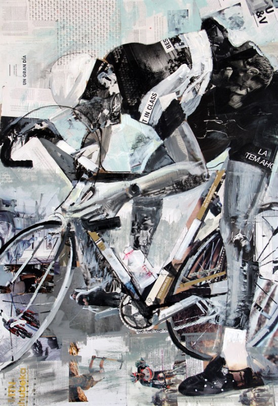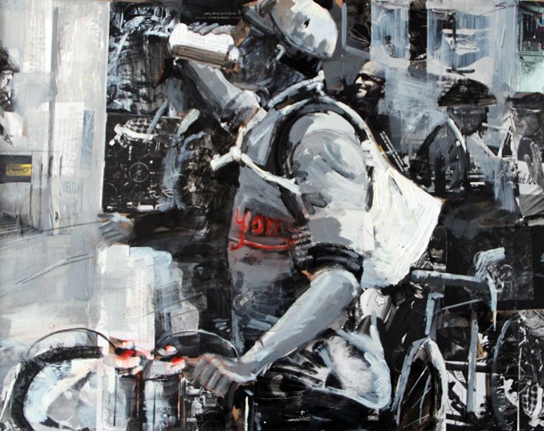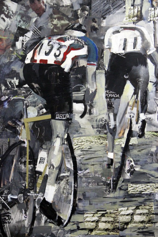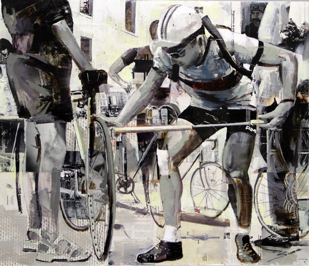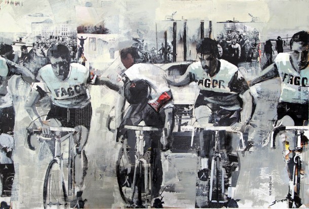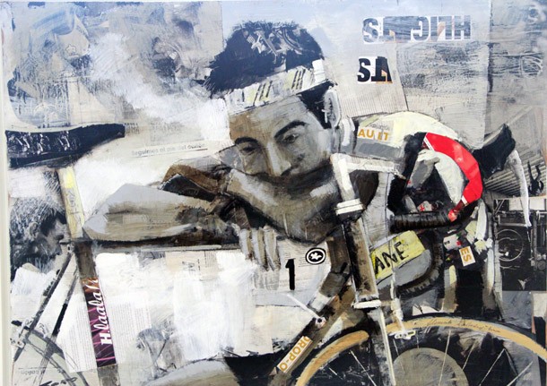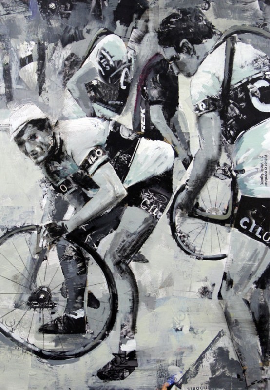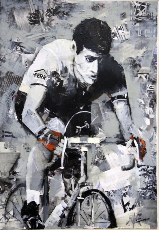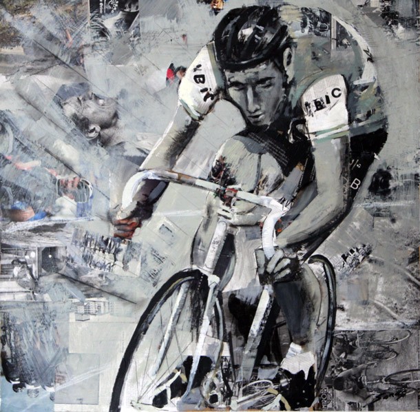 Las pinturas acrílicas de Miguel Soro –uno de los artistas que acuden al ciclismo como inspiración y que cuentan con mayor reconocimiento internacional- permiten realizar un recorrido por la Historia del deporte del pedal. Son cuadros que retratan un ciclismo antiguo y apasionante, con unos protagonistas y unos valores que dan sentido a la infinita afición que hoy existe por la bicicleta. Soro refleja ciclistas al límite y campeones mostrándose más allá de los podios y los laureles. Ahí está Bernard Hinault apoyado en el cuadro de su bicicleta. El Caimán parece reflexionar y planificar la carrera, mientras en la escena contigua un corredor anónimo se hidrata bidón en mano momentos antes de iniciar una etapa.