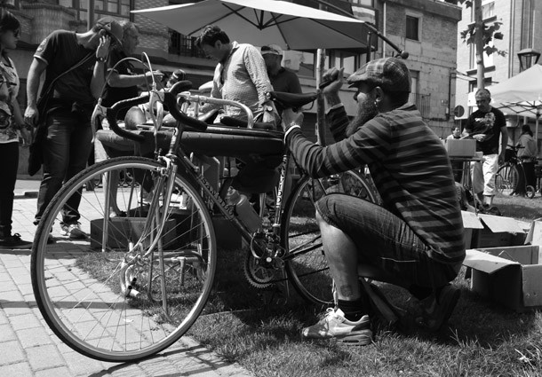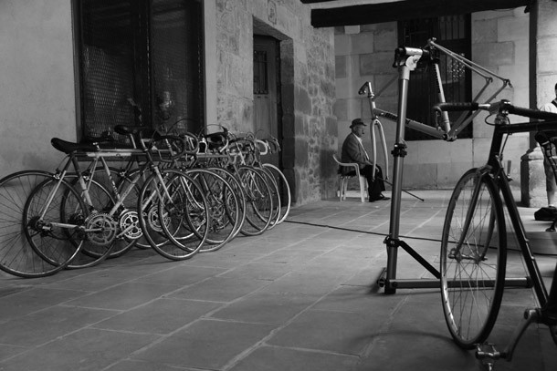 Mientras, en la calle principal de Cenicero circulan ciclistas y bicicletas que tiñen el municipio vinícola de colores y tejidos de otra época. En el hangar de la Eroica, bajo los soportales, se afanan en poner a punto cada bicicleta que cae en sus manos. Son más de 650 participantes que quieren que sus monturas les lleven sin problemas por los caminos dibujados entre los viñedos y caminos que rodean Cenicero. “Ya han alquilado –nos cuentan en el improvisado garaje- más de treinta bicicletas”.