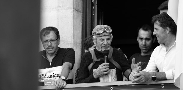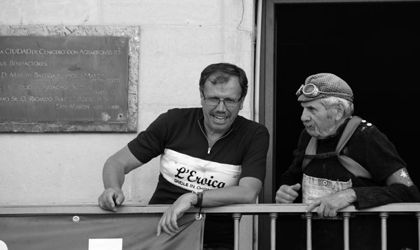 Silvestre se reunión con el alcalde y la corporación del municipio riojano y las planteó la idea. Fue hace cuatro años, tiempo en que ha estado –junto con su equipo- trabajando el proyecto. La intervención de una tercera amistad –en esta ocasión un ciclista italiano con el que Miguel había realizado una ruta a través de Mongolia- resultó imprescindible para llegar hasta Giancarlo Brocci –creador de la Eroica. En el mes de noviembre, la Eroica Hispania estaba en marcha. “Gracias –recuerda- a tres amigos”. Así que Gailo in Chianti y Cenicerto estaban destinadas a entenderse. “Tanto –cuenta Miguel- que se ha dado la anécdota de que el alcalde italiano nos ha dado las gracias por colocar la bandera de su pueblo en el balcón del Ayuntamiento…y ha resultado que las banderas de ambos municipios son iguales”. Así, que cuando se trata de ciclismo de leyenda, el destino parece viajar en bicicleta y entre viñedos./Javi Muro