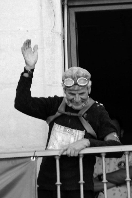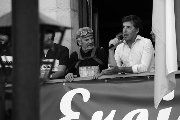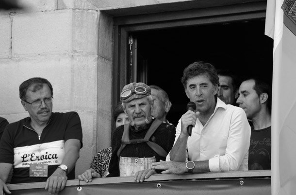 En los puestos ubicados en la calle, los participantes curiosean entre malliots vintage y piezas de repuesto para que al iniciarse la prueba su imagen sea realmente de otra época. Para dar la bienvenido a los centenares de participantes, la organización de la Eroica Hispania ha contado con Pedro Delgado. Este año se cumplen treinta años de su victoria en la Vuelta a España en la penúltima etapa de aquella edición, cuando se escapó junto a Pepe Recio y volteó la clasificación general que hasta ese momento -11 de mayo de 1985- lideraba Robert Millar. Entonces Perico se convirtió en una estrella, que aumentó su luz con una victoria en el Tour de 1988 y la Vuelta de 1989. Delgado continúa entusiasmando y admirando, cuando se asomó al balcón del Ayuntamiento de Cenicero en la plaza no cabía un alma.