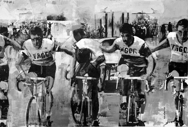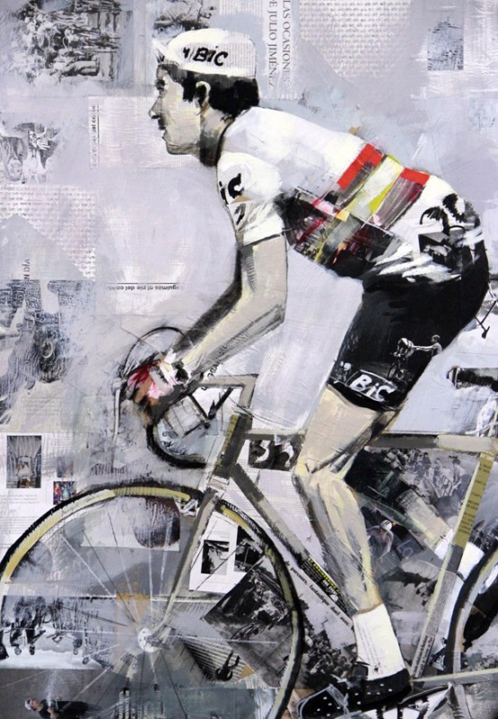Un ciclismo de tipos elegantes como Jaques Anquetil, que afronta la línea de meta agarrado a la parte baja del manillar o un ciclismo que se introduce en el diccionario para enriquecer nuestra lengua, tras observar a Pedro Delgado lanzarse a ‘tumba abierta’ en el descenso del Peyresourde en el Tour de 1983, enganchado de nuevo a la bicicleta a toda una generación. Un ciclismo en el que los apodos –como el relojero de Segovia- definían las actitudes y el carácter de los corredores. Todos están en la exposición de Miguel Soro, que a través de sus pinceles no sólo retrata momentos sino que también cuenta emociones.