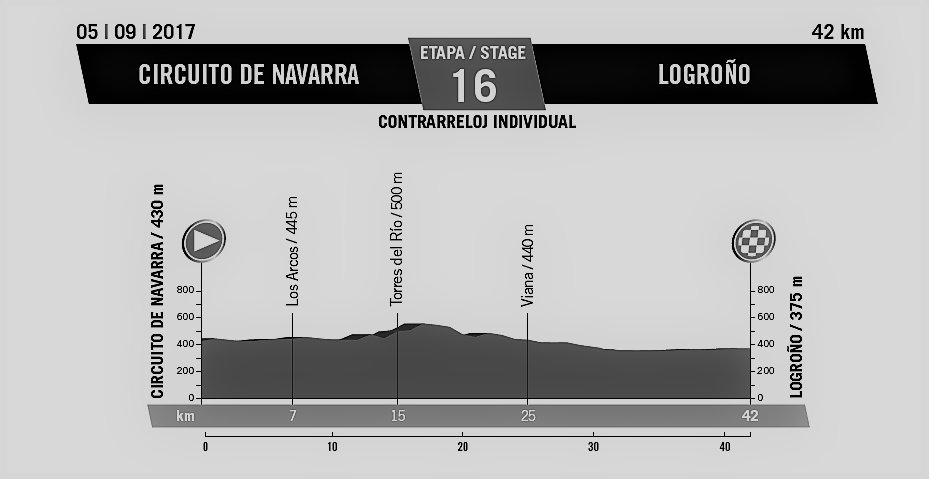 Logroño acogerá la contrarreloj larga -42 kilómetros- de la Vuelta 2017 y de nuevo al analizar el recorrido aparece como uno de los puntos esenciales de la carrera. Será la etapa 16 de 21 –veinte si tenemos en cuenta que la última suele ser de homenaje al ganador- y estará situada en la última semana de competición. Después restarán dos etapas de media montaña y dos de montaña. Es cierto que una de ellas finaliza en el mítico Angliru, pero también lo es que en la cima asturiana rara vez se producen grandes diferencias entre los favoritos a la victoria en Madrid. Así que la crono individual de Logroño será una de los días señalados de la Vuelta por todos los equipos, directores y corredores que tengan la clasificación general en su mente. También para los especialistas en la lucha contra el crono, aunque en las grandes vueltas este tipo de pruebas suele estar reservadas –al estar situadas a final de competición- a los ciclistas que pugnan por el liderato.