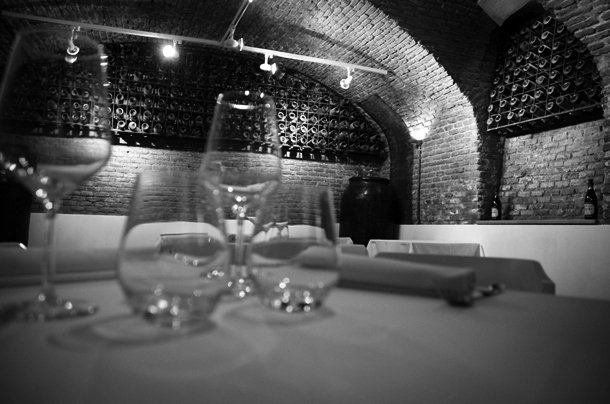 Si seguimos hacia el fondo llegamos al office. Mesas con manteles de cuadraditos, sillas de color blanco y amarillo pistacho, alacenas y al fondo la cocina. ¡Como en casa!En la planta baja encontramos la cava. Paredes de ladrillo visto y un histórico botellero. Perfecto para celebraciones. Una zona más tranquila, un reservado perfecto.