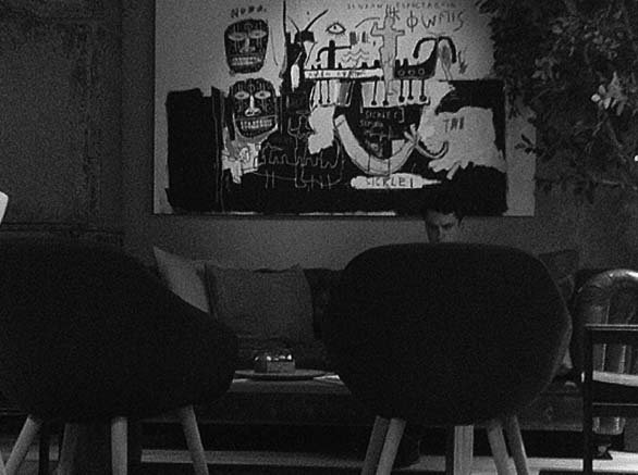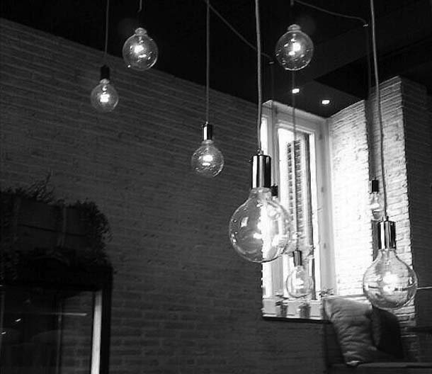 También en la planta alta encontramos un gran salón con paredes de ladrillo visto blanco, suelos de madera al igual que las mesas, tubos de aire acondicionado al aire, techos grises, sofás corridos con cojines, grandes cuadros de estilo moderno y bolitas de cristal transparente que cuelgan de los altos techos para ilumimar la sala. De día, el local es muy luminoso gracias a la luz que entra por los grandes ventanales que dan a la calle Fernando VI. La pared que ejerce de fondo la comparten un jardín vertical muy original y un botellero, se trata de una zona más elevada que el resto del salón que resulta muy acogedora.