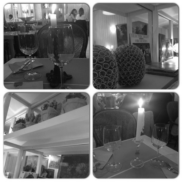 En la entrada encuentras una barra de mármol y una mesa pequeña a modo de hall donde podrás esperar para ocupar tu mesa mientras tomas una copita de vino. Al entrar, el salón aaprece alargado con una pared de madera a la izquierda y a la derecha ventanales sobre paredes desconchadas, como si estuvieran sin terminar. Un toque diferente que se mezcla perfectamente con el resto de objetos y el mobiliario. El techo de escayola con remates resalta con las paredes de aspecto descuidado. Las sillas todas diferentes unas de las otras algo muy moda últimamente.