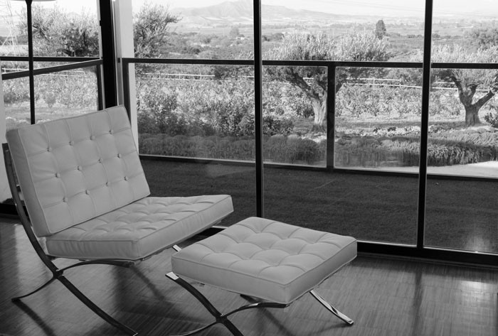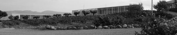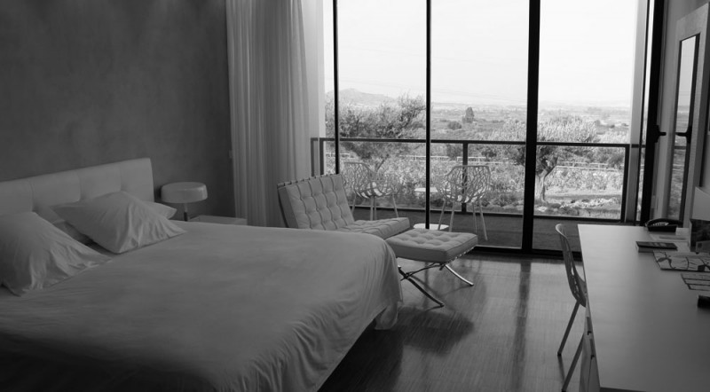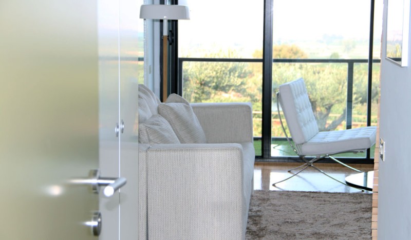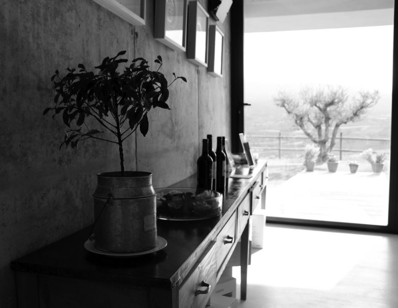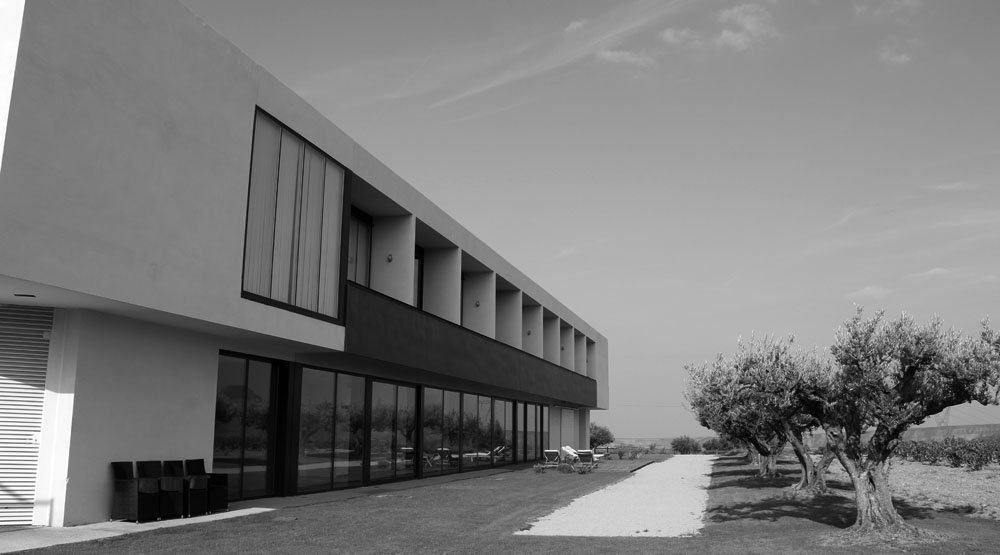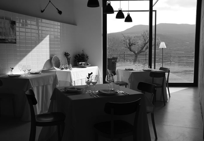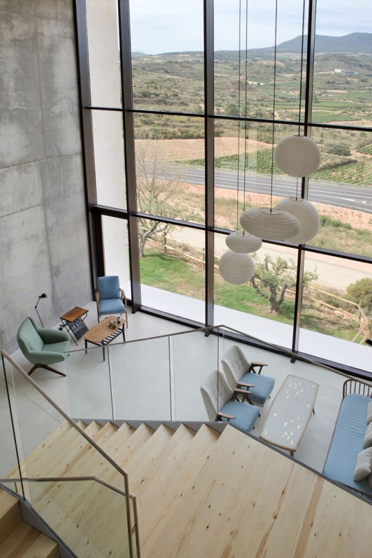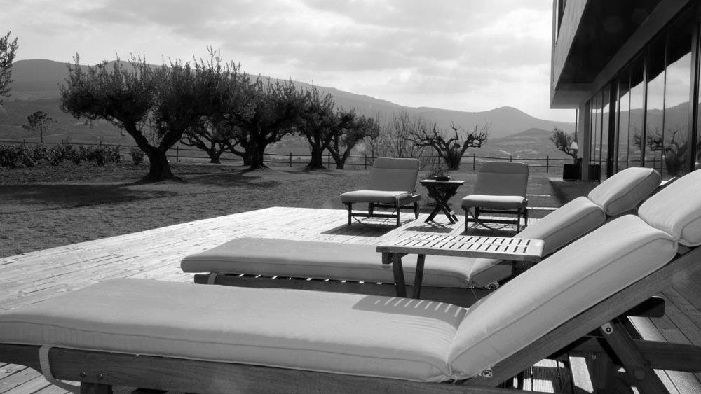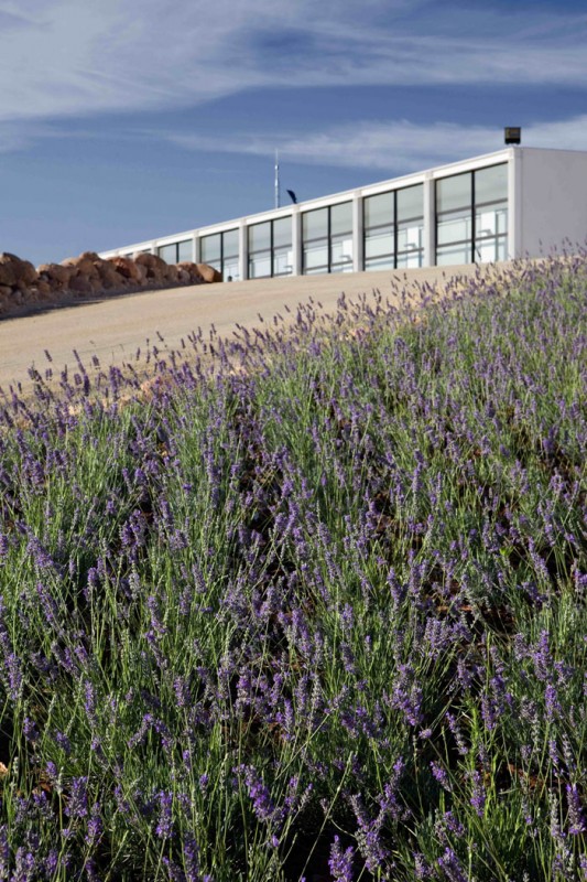 Ese cariño por la tierra y ese cantarral, esa línea de piedras, se han transformado en una arquitectura blanca y luminosa que se asienta en lo alto de una finca de seis hectáreas. Una línea cóncava –describe el arquitecto, Javier Arizcuren- apuntando hacia el paisaje lejano y una línea convexa que dirige la mirada hacia el interior de la parcela, hacia los viñedos y los olivos, abrazándolos. Y así, desde su posición, el edificio invita a detenerse a contemplar las espectaculares vistas a través de los grandes ventanales que recorren sus fachadas.