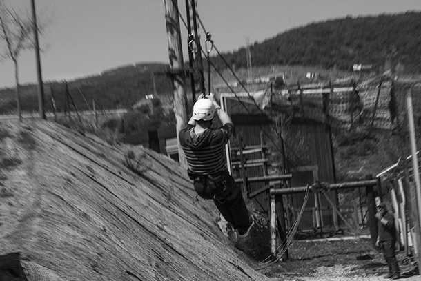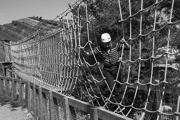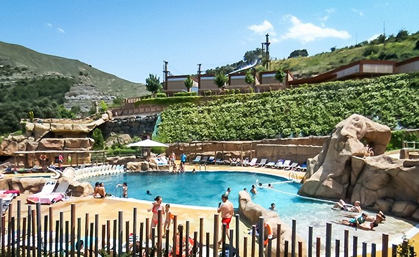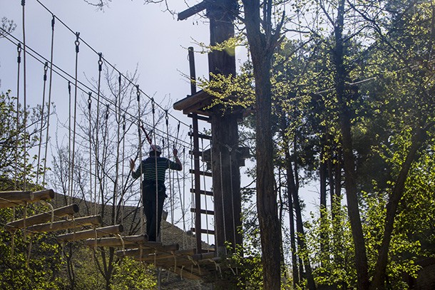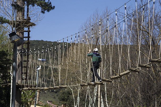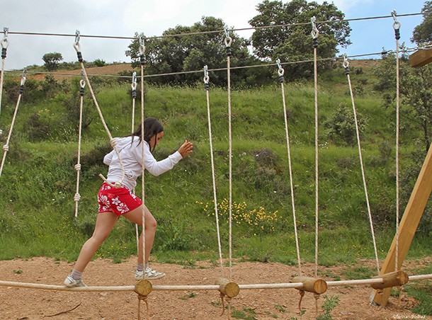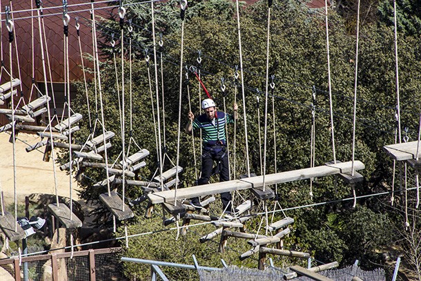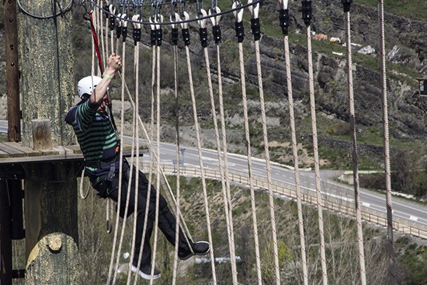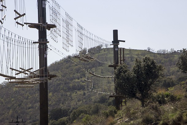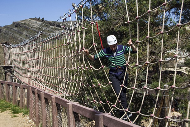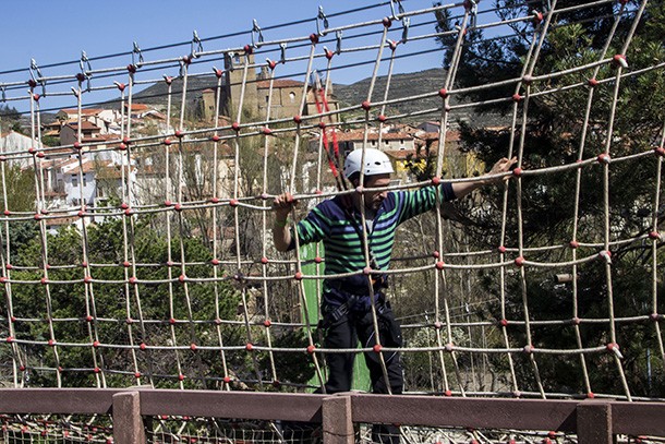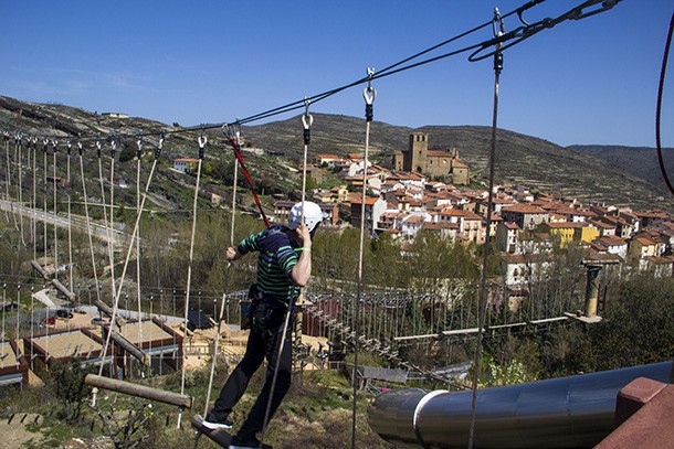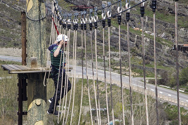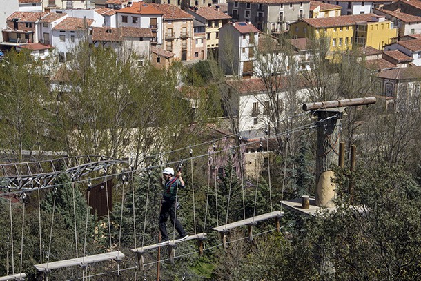 Pero como todo el mundo sabe, llegar hasta un yacimiento que esconde una parte de la historia pasada del planeta implica vivir toda una aventura. En El Barranco Perdido sucede de igual manera. Así, el Circuito Multiaventura reta al visitante a ascender la Colina Encantada a través de puentes tibetanos y de equilibrio, tirolinas y toboganes. La ruta de ascenso -que permite observar el valle, las montañas limítrofes, el pueblo de Enciso que conforme vamos adquiriendo altura va situándose a la misma altura que nuestros ojos y la espectacular barrera que forma la pared principal de la presa- cuenta con un trazado con una veintena de juegos de puentes, pasarelas, redes y obstáculos de paso. Una vez alcanzada la cima las opciones se multiplican. Siguiendo la pista que nace junto al mirador en el que desemboca el último de los puentes volados se llega a los yacimientos de icnitas. Si la opción es el descenso, el tobogán te ofrece una vertiginosa bajada hasta la plaza central del parque. Si el visitante quiere disfrutar de las vistas comprobará que El Barranco Perdido se ha construido sobre una superficie de 14.000 hectáreas, siguiendo la misma estructura de terrazas sobre la que levanta justo enfrente el pueblo de Enciso.