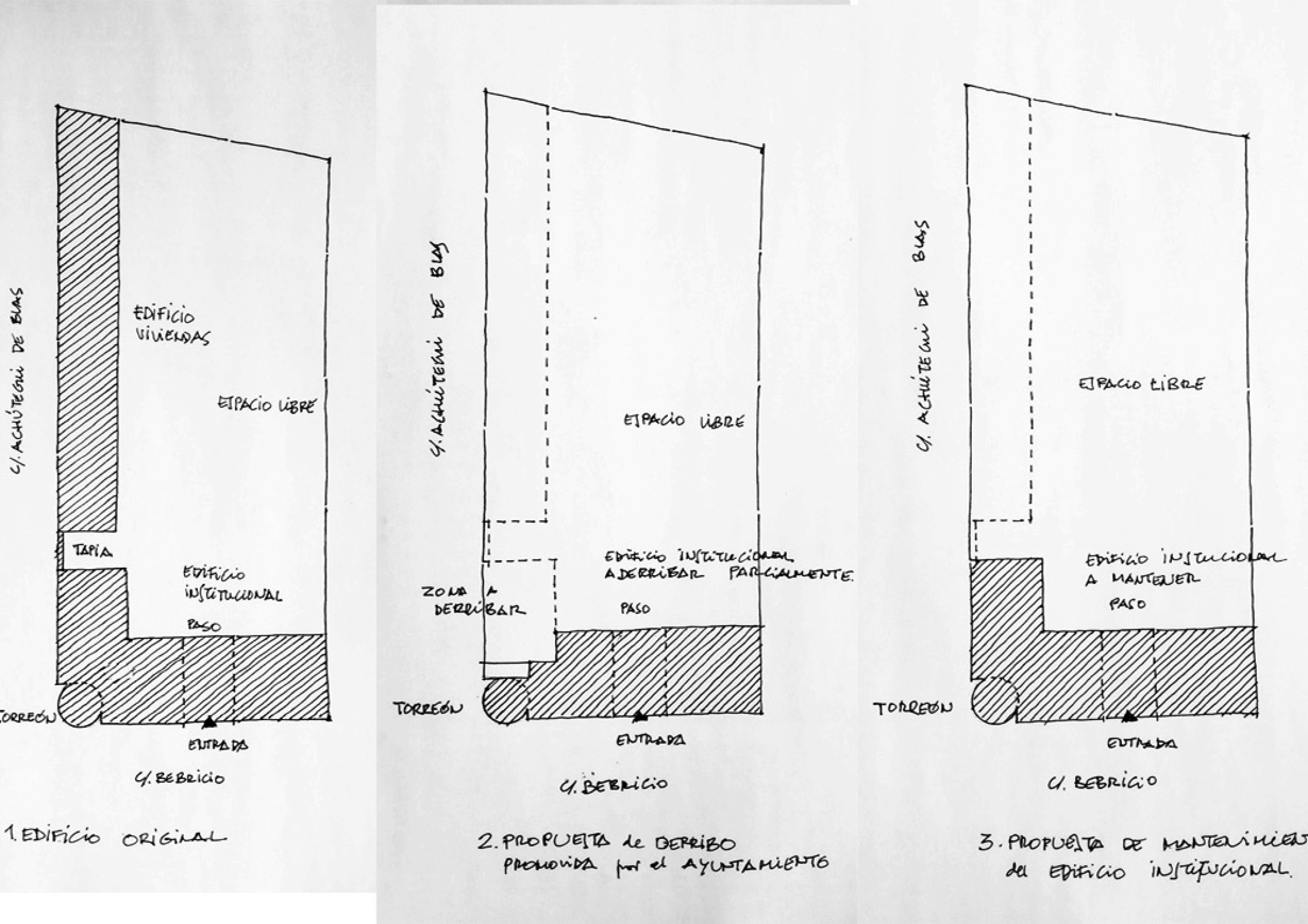 Se reconsidere el ámbito del derribo y se mantenga el cuerpo en ángulo que conforma la zona institucional-administrativa constituida por las dos piezas que dan fachada a las calles Bebricio y Achútegui de Blas.