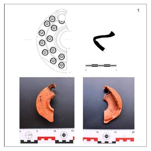 Junto a todo ello ha aparecido también una lámpara o lucerna, con unas dimensiones de unos 10 centímetros de diámetro, “derivada de disco, de pasta anaranjada, dura, fina y bien decantada”, explican los autores, y que “presenta un barniz igualmente anaranjado, homogéneo, espeso, consistente y bastante bien conservado que alcanza el interior del depósito”.