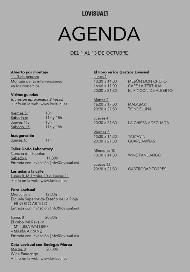 Del 1 al 13 de octubre, LOVISUAL transforma la ciudad en una galería a pie de calle -en los lugares del día a día- que vincula la creatividad y el diseño con el comercio de la ciudad, su seña de identidad. Los tres primeros días del certamen está dedicados al trabajo de los artistas en los propios comercios. La apertura de LOVISUAL al público será el día 4 de octubre. Además de las intervenciones en comercios, LOVISUAL propone en su programa Foros, Aulas en la Calle de la mano de la ESDIR (Escuela de Diseño de La Rioja), Talleres, Galardones, Visitas Guiadas, Visitas a Colegios, a los que se suman en la edición 2018 los Espacios Gastro, encuentros informales de túa tú con los creadores y diseñadores participantes en LOVISUAL y que tendrán lugar en Mesón Don Chufo, Café La Tertulia, El Rincón de Alberto, Tastavín, Malabar, Tondeluna, La Chispa Adecuada, Guardaviñas, Wine Fandango y Gastrobar Torres.