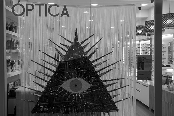 ‘Equilibrio’ es la obra de Alejandra Gómez en la Clínica de Nutriestética. “A través de un estudio de las formas, los cuerpos y el espacio -cuenta- represento el equilibrio físico y mental”. En la óptica ‘Abrelosjos’ ha intervenido la arquitecta María Camba con la propuesta ‘El ojo que todo lo ve’. “El ojo que todo lo ve -describe- presente en toda la civilización occidental, era un ojo mágico. Protegía, purificaba y sanaba. Simbolizaba el sol y encarnaba el orden, el estado perfecto. En esencia era un amuleto”.