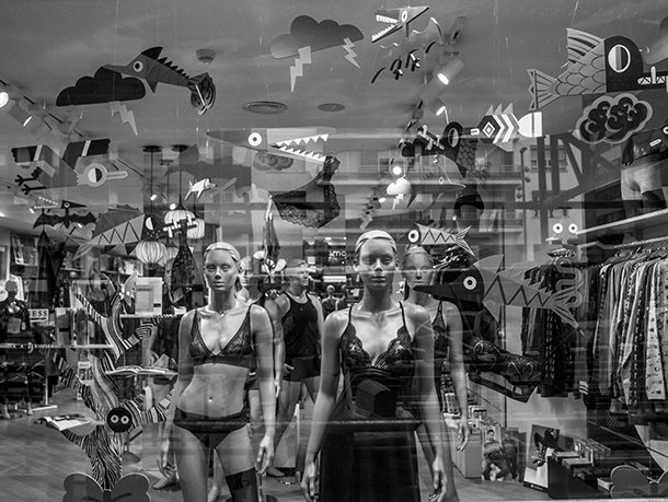 En la lencería Anayvi la conversación creativa ha tenido como protagonista al dibujante Jorge Ochagavía. Bajo el título de ‘Los ladrones de lencería’, el ilustrador ha creado una fauna de cuernos, colmillos, alas, y escamas. Mientras, el equipo de arquitectura técnica y diseño de interiores Perspectiva MOMA ha aplicado un cambio de piel al Centro Óptico Capitol. Lo han llamado ‘Muda’ y recuerdan que “habitamos espacios cambiantes que se renuevan y se transforman para adoptar un nuevo aspecto. Los espacios comerciales tienen la capacidad de crear sensaciones. Forma, volumen, color y luz han sido las herramientas empleadas para hacer realidad la muda”.