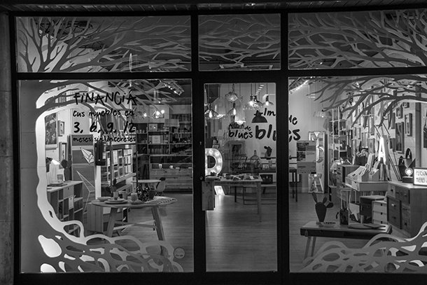 La madera es la seña de identidad de la tienda de mobiliario Alma de Blues, ubicada en el pasaje que enlaza las calles Gran Vía y Avenida de Portugal. En Alma de Blues la madera es protagonista y así los han entendido el dibujante Gorka Olmo, que con la obra ‘Árboles que se juntan’ ha creado una instalación en la que dos árboles recorren el escaparate.