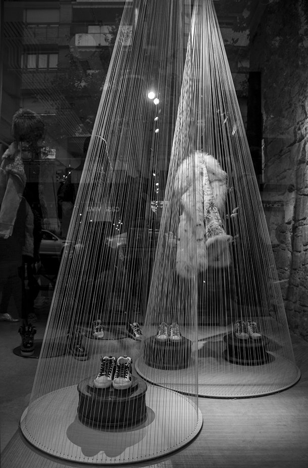 El escaparate de Stlan acoge la propuesta Kado de los diseñadores Gouda y Figueroa, que han creado una colección de jarrones que desafían el arquetipo tradicional, conos invertidos que reposan en aparente equilibrio imposible. A tan sólo unas calles de distancia, en la Librería Santos Ochoa el artista visual y diseñador gráfico Javier Triviño ha desarrollado ‘Saturno’. “Un collage tridimensional, en el que la disparidad de materiales es absorbida por la gravedad”.