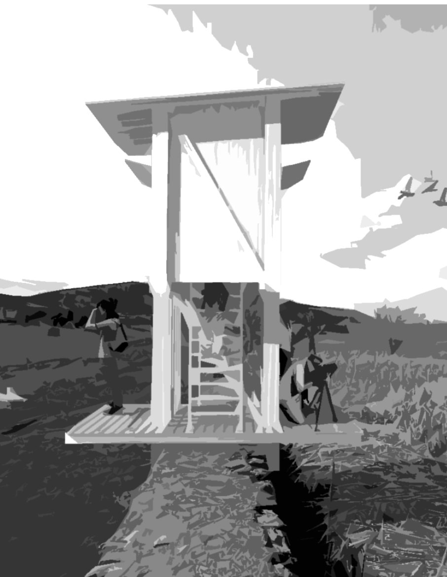 La Dehesa. 'Ground Control' es una instalación permanente situada en el enclave natural de interés paisajístico de 'La Dehesa' de Valgañón, ideada para disfrutar y convivir con el jardín de aves y anfibios que es esta pequeña laguna de alta montaña. Se recupera un lugar de encuentro histórico del municipio, consiguiendo una nueva relación con el mismo. La instalación, como última torre del camino entre el núcleo urbano y la naturaleza, permite una visión de 360 grados y erige un nuevo símbolo desde el que disfrutar y relacionarse con el paisaje. Se persigue la integración de la pieza en su entorno a través de una propuesta hecha a medida pensada desde la ligereza y los materiales naturales.