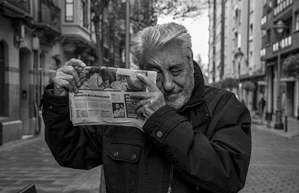 Yo veo todos los días, por internet, las primeras páginas de todos los periódicos de España. Es un ejercicio que me hace gracia. Hay veces que una misma foto está en cinco o seis portadas, suele tratarse de un hecho que haya sucedido donde haya sucedido afecta a todo el país. Pero sucede que ese mismo hecho otro periódico no lo toca y lleva a primera página una noticia que sólo afecta a la localidad donde se edita el periódico, como si sólo mirara a su localidad y no más allá. La foto de primera es la que junto a la cabecera es lo más importante que ese periódico puede dar ese día. No es lo mismo la portada del ABC que la portada de El País. Por ejemplo, el ABC suele llevar a portada una imagen creativa, compone una imagen, que tiene que ver con su titular. No es una foto documental, no es real, es creativa, es una composición creada. Eso sólo lo hace el ABC. Lo habitual, es la que va con el titular de apertura. Me gusta también que la foto sorprenda; que haya dos titulares, el de cabecera y el de la foto de portada. Además, antes el criterio principal era el lector; ahora me da que hay otros criterios… como que no se moleste no se quién, otros intereses, digamos, existe una confusión ahí…. Los lectores han quedado en segundo lugar, ha quedo relegado, y a veces cuáles son los intereses…