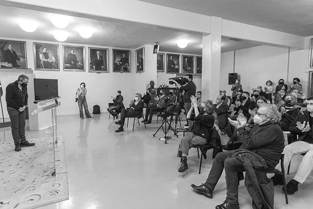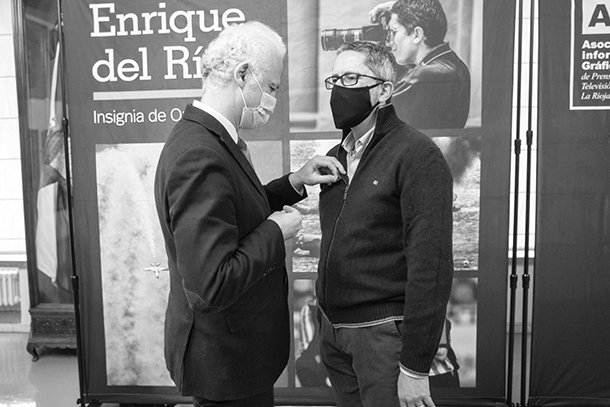 Acompañado por familiares, amigos y compañeros de profesión -muchos de ellos coincidentes en ambos títulos- Enrique del Río ha recibido la Insignia de Oro 2022 de AiG, en el marco de un ‘Salón de Retratos de Alcaldes’ del Ayuntamiento de Logroño que rara vez ha presentado tal reunión de personas dispuestas a rendir un homenaje. En su agradecimiento, Del Río volvió a hacer gala de su espíritu periodístico al reconocer que “nunca esperas una distinción como fotoperiodista porque nunca piensas que vas a ser el protagonista de la noticia”. El fotógrafo del periódico La Rioja mostró, una vez más, su carácter generoso y de ‘gendelman’ al sembrar distancia con la brillantez de los fotoperiodistas distinguidos con la insignia de oro en ediciones anteriores y su propio trabajo. Pero ahí, con todos los respetos, se equivocó, porque siempre será más sencillo hacer buenas fotos de la actualidad en un Madrid iluminado con grandes focos y con fondos de estudio cinematográfico, donde se ha decidido que pase todo, que una ciudad extraordinaria donde el primer objetivo es vivir bien. Para contar buenas historias a través de la fotografía en Logroño es preciso que el talento esté activado a diario, porque muchos días son el mismo y eso no es malo, pero exige al fotoperiodista no abandonar la búsqueda permanente.