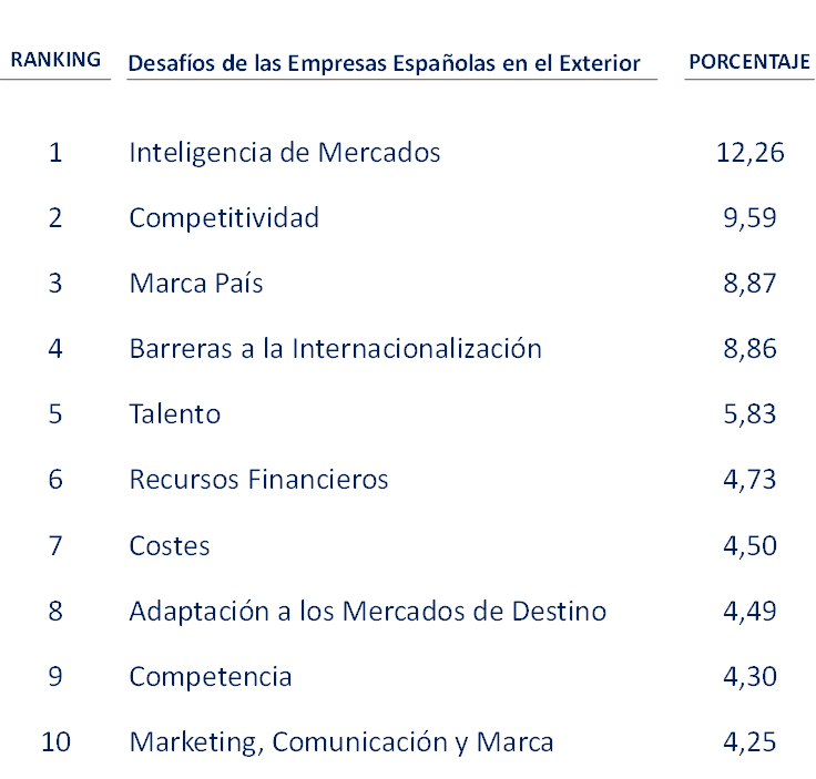 El informe, que es parte del estudio Desafíos de España en el Exterior, identifica una treintena de retos a los que se enfrentan las empresas españolas en los mercados exteriores, confeccionando así un mapa 360 de los desafíos y preocupaciones manifestadas por los directivos y ejecutivos de internacionalización.
