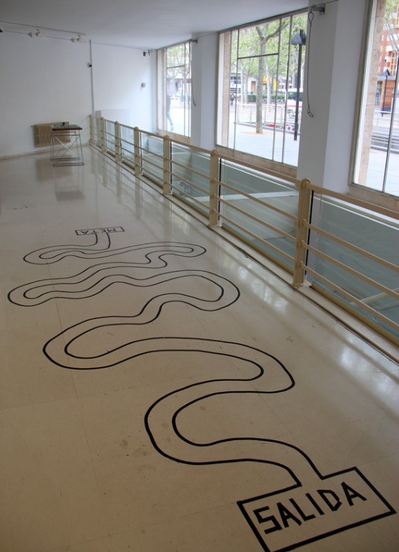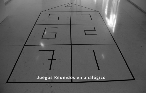 La exposición reúne una cuidada selección de entretenimiento que demuestra cómo antes de la era digital, los niños también sabían divertirse con los recursos que tenían a su alcance. Sobre el suelo de la Sala está silueteado un juego del Cazo. Un grupo de niños lanza, sobre lo que en las calles y plazas era clarión, una piedra simulada y a la pata coja trata de arrastrarla siguiendo los números situados en cada vértice./Javi Muro