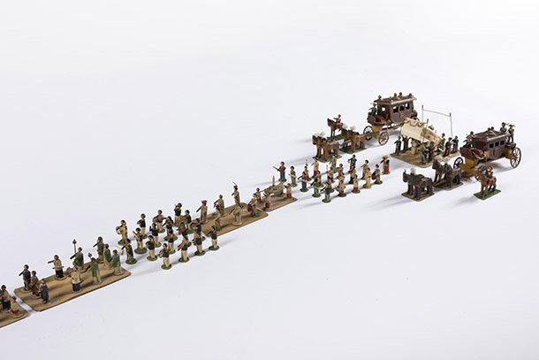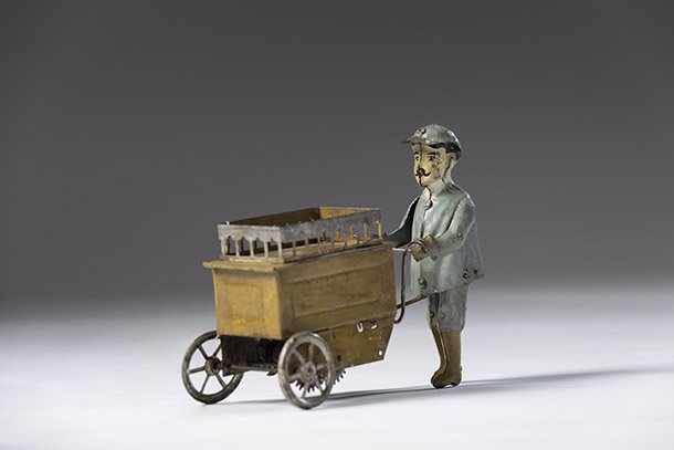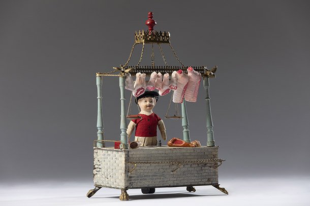 Por último, muchos juegos y juguetes implican un proceso de imitación o simulación social en aspectos más complejos y colectivos, como el hogar, escuelas, oficios y actividades comerciales… que también tenían su reflejo en objetos como remedo de la propia vida. En este punto hay piezas como carnicerías, mercadillos y oficios diversos que ponen de manifiesto que el niño se anticipa a su papel de adulto a través de la imaginación.