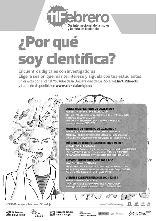 La Rioja se suma a la Iniciativa 11 de Febrero, que conmemora el Día Internacional de la Mujer y la Niña en la Ciencia, con un programa de sesiones online -del lunes 8 al viernes 12 de febrero- en el que investigadoras contarán a estudiantes de Educación Primaria, ESO y Bachillerato ‘Por qué soy científica’. Las sesiones, que versarán sobre distintas ramas de la Ciencia y la Tecnología, se emitirán por el canal Youtube de la Universidad de La Rioja (http://bit.ly/URdirecto) y por la web www.ciencialarioja.es. Se podrá seguir tanto en directo como en diferido, pues la grabación se conservará en ambas plataformas.