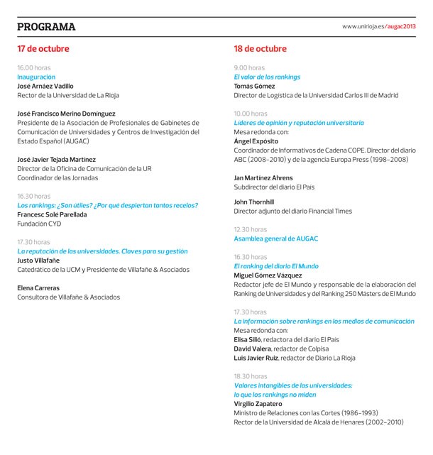 En la sesión de tarde, intervendrá el redactor jefe de El Mundo Miguel Gómez Vázquez, responsable de los rankings de carreras universitarias y de másteres que edita dicho periódico. A continuación, se abordará el fenómeno de los rankings en los medios de comunicación a través de una mesa redonda en la que intervendrán los periodistas Elisa Silió, de El País; David Valera, de Colpisa; y Luis Javier Ruiz, de Diario La Rioja.