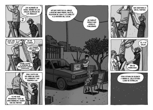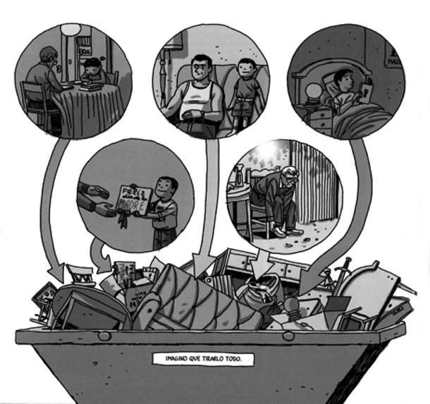 “Es el tebeo que más me ha cambiado”, confiesa Roca a Gregorio Belinchón. “Surge de un momento que para mí fue particular – dice Roca a Rodrigo Terrasa -, que es perder a mi padre y ser padre casi al mismo tiempo. Es una historia tan personal, tan ligada a los sentimientos, que si la dejaba pasar quizás ya no me apetecería hacerla“. Como el padre real, el padre dibujado ha muerto y su casa de verano, construida con sus propias manos, las de su mujer y sus hijos, comienza a deshacerse. Hasta este fin de semana, en el que los tres hijos –Vicente, José y Carla– han quedado para darle un lavado de cara, tirar los trastos viejos, poner el cartel de SE VENDE en la cancela que nadie abre desde que el padre murió.