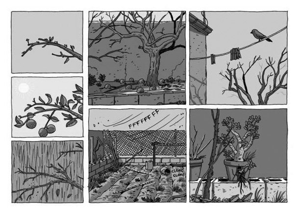 Primavera, verano, otoño, invierno. Las naranjas se secan en el suelo, bajo las ramas del frutal desnudo. Dispersas entre los surcos resecos del huerto crecen matas de malas hierbas. Las raíces de un cactus atraviesan la pared de su maceta, en un desafío al abandono que no tiene más espectadores que pájaros indiferentes. En la cuerda de tender, un puñado de pinzas esperan una mano que nunca volverá a apretarlas para prender la ropa mojada. A Paco Roca le bastan este puñado de viñetas para resumir el paso del tiempo en la casa abandonada que titula su última novela gráfica.