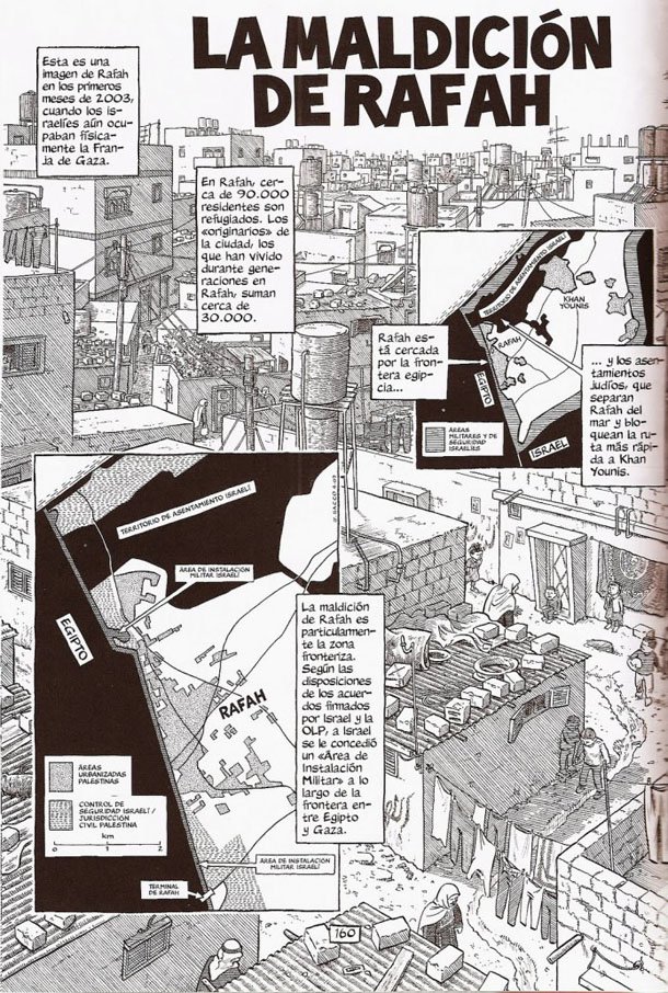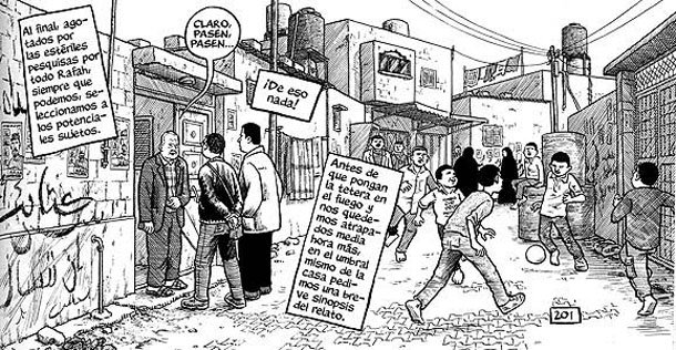 Mientras avanza en su investigación, Sacco nos muestra el inmenso campo de concentración que es Gaza, una cárcel que crece en vertical, donde malviven un millón y medio de palestinos, sometidos a la caprichosa arbitrariedad de los soldados israelíes. Es muy fácil ser maniqueo, pero Sacco no cae en la trampa.