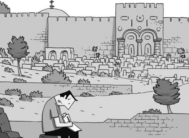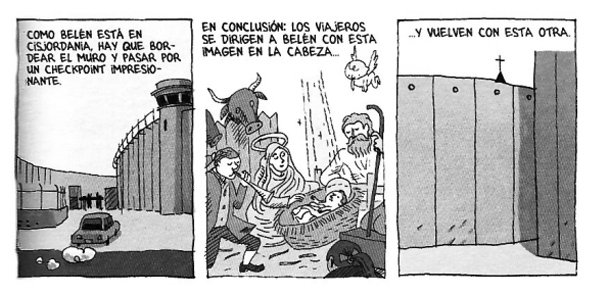 “Esta región es agotadora”, le dice Sébastien, un empleado de la Alianza Francesa, a Guy Delisle en uno de los muchos viajes a través de los checkpoint que trocean Jerusalén. Y ciertamente lo es para el lector, que camina por la ciudad tres veces santa a través de las viñetas de Delisle, con la mirada sorprendida de un católico madurado en ateo que descubre una ciudad trofeo y fortaleza. A Delisle le fascina el muro de láminas de hormigón y torres de castillo medieval que domina el horizonte y una y otra vez acaba dibujando lo que ocurre en los alrededores de esta barrera levantada para impedir atentados terroristas y que ha partido la vida de centenares de miles de palestinos.