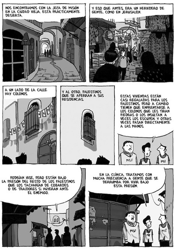 En ‘Crónicas de Jerusalén’ Delisle cuenta con humor sus desventuras como amo de casa en una ciudad antipática para casi todos, más si tienen niños pequeños, pero su relato se eleva cuando cuenta sus problemas para entrar y salir de Israel cada vez que tiene que coger un avión, su imposibilidad para dar un taller de cómic en Gaza –está convencido de que los israelíes le prohíben ir a la Franja porque le han confundido con Joe Sacco–, la indiferencia de la población ante la omnipresencia de hombres armados o sus visitas a los barrios de ultraortodoxos y colonos, nada amistosos con los turistas o con los cooperantes de MSF. “Son dos mundos que están al lado pero viven de manera paralela”, comenta Delisle a Villaécija.