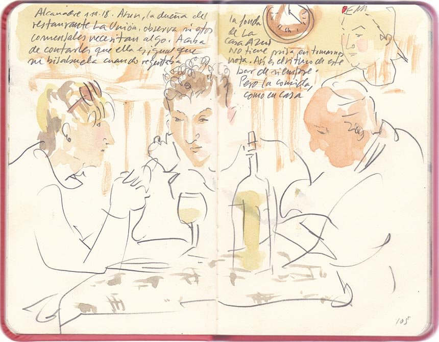 Asun, la propietaria del restaurante 'La Unión', en Alcanadre, observa si estos huéspedes necesitan algo. Antes pasó un buen rato diciéndoles que es como su abuela cuando tenía la posada 'Saludos'. No tiene prisa para tomarnos nota, así es el ritmo de este bar de siempre. Pero la comida es como es casa. /Javier de Blas. Artista y corresponsal de urbansketchers.org en España.