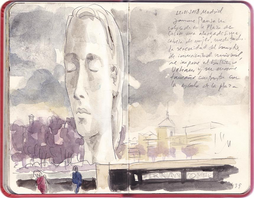 En Madrid, en Colón, hay una alargadísima cabeza de mujer meditando, de Jaume Plensa. La serenidad del busto, de mármol inmaculado se impone al bullicio urbano y su enorme tamaño hace anecdótico el entorno.