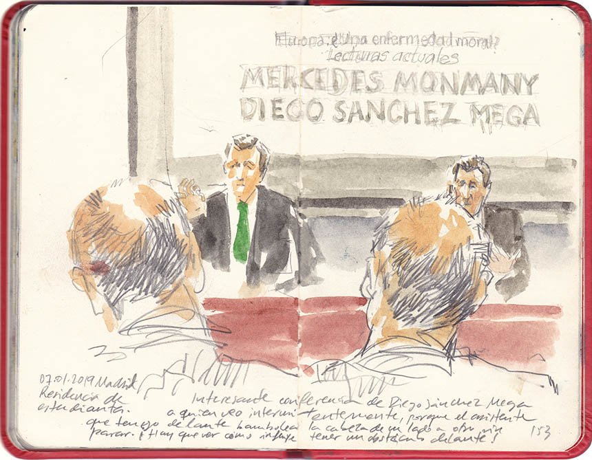 Estoy en la Residencia de Estudiantes de Madrid escuchando al doctor Sánchez Mega. El hombre delante de mí bambolea la cabeza en un interminable ping pong. Siento el mareo de quien conduce con le limpiaparabrisas puesto. Al dibujar al catedrático por duplicado comprendo cómo un obstáculo llega a influir en lo que percibes.