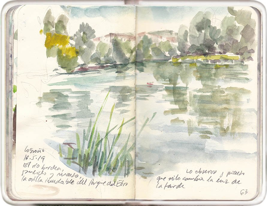 El río entra, pulido y manso bordeando la orilla inundable del parque del Ebro. Lo observó y pienso que sólo cambia la luz de la tarde.