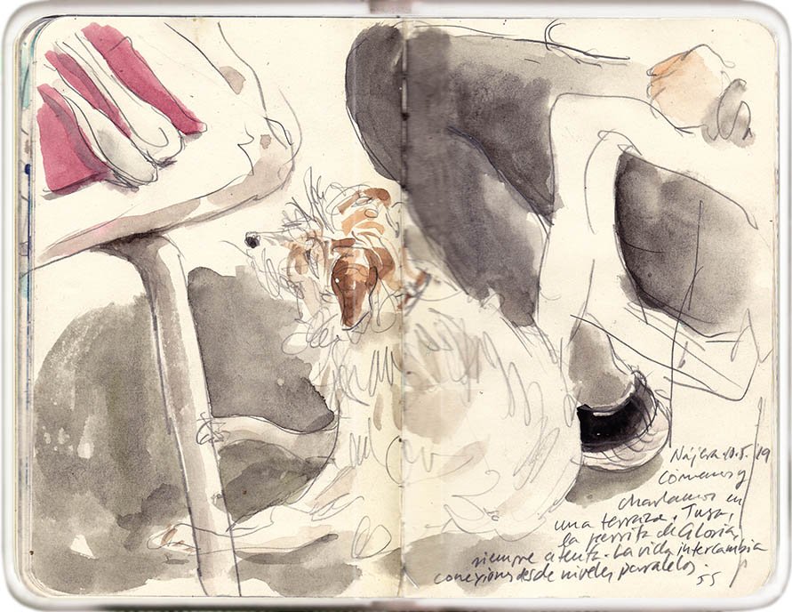 Comemos y charlamos en una terraza. Tusa, la perrita de Gloria, bajo la mesa, siempre atenta. La vida es un continuo intercambio entre niveles paralelos.