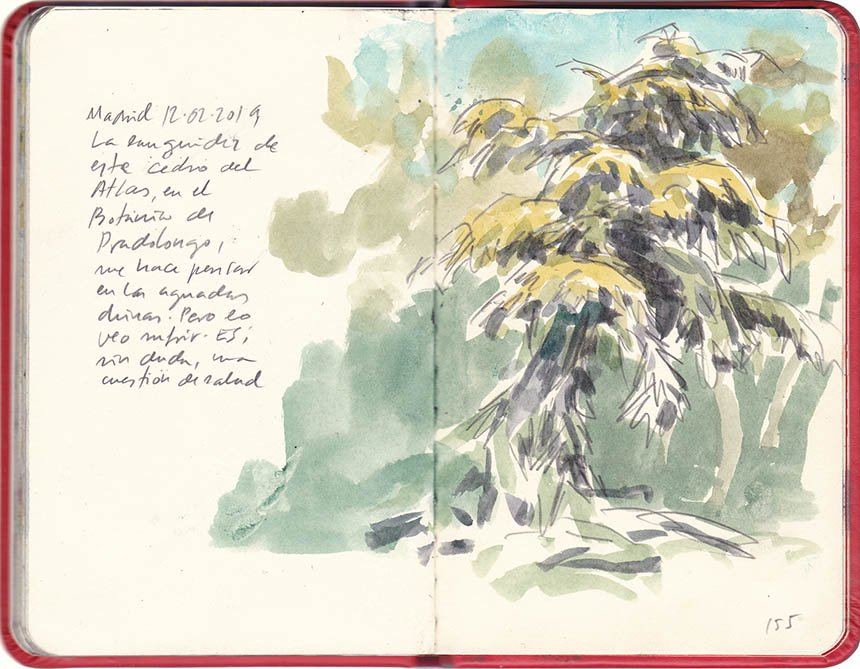 Madrid. Botánico de Pradolongo. La languidez de este cedro del Atlas me hace pensar en las aguadas chinas. Pero lo veo sufrir. No, lo suyo no es cuestión de estética, sino de salud.