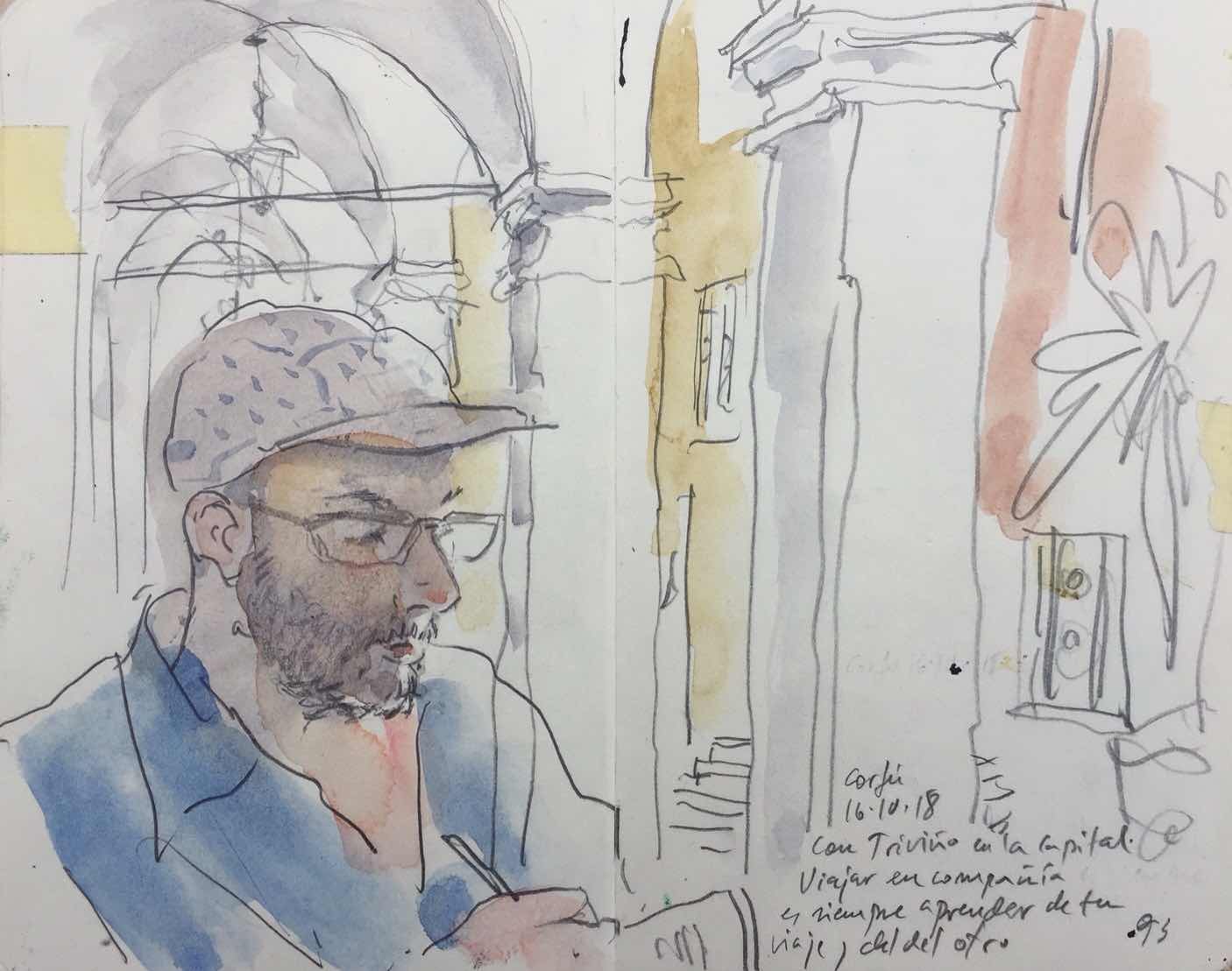 Corfú. Javier Triviño. El Café Mikros. Viajar en compañía es siempre aprender de tu viaje y del del otro./Javier de Blas. Artista y corresponsal de urbansketchers.org en España.