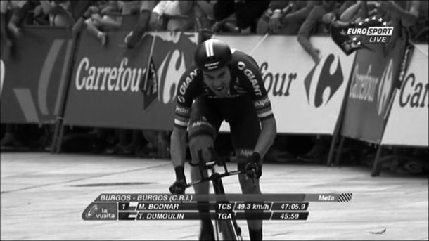 * Imagen de la restransmisión de la Vuelta a través del canal Eurosport, comentada por Agustín Castellote y Eduardo Chozas.