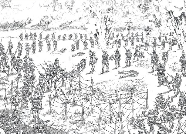 Las 24 láminas de este libro fuelle, original y único, son un viaje en el tiempo. En sólo unos centímetros transcurren horas, incluso un día. Lo vemos desde la primera lámina, la única protagonizada por un personaje con nombre y apellidos. Sacco retrata al general Douglas Haig en tres momentos distintos: a la salida de su misa diaria y matinal, dando su paseo solitario antes del almuerzo y cabalgando por la tarde con su pequeña escolta. Después comienza el desfile de soldados anónimos. No hay ningún Wally que buscar pero si multitud de detalles que sólo se aprecian después de varias miradas. ¿Cuántos soldados ha dibujado Sacco? Sin duda alguien los contará, pero se equivocará si cree que todos son distintos. Porque aunque no conocemos sus nombres, hay soldados a los que vemos primero camino del frente, saludando sonrientes a una cámara de cine, fumando en pipa en una pausa del camino, desayunando después en las trincheras repletas, calando sus bayonetas justo antes de saltar al combate al grito de su oficial, heridos en los primeros minutos del ataque y agonizantes después en las láminas finales.