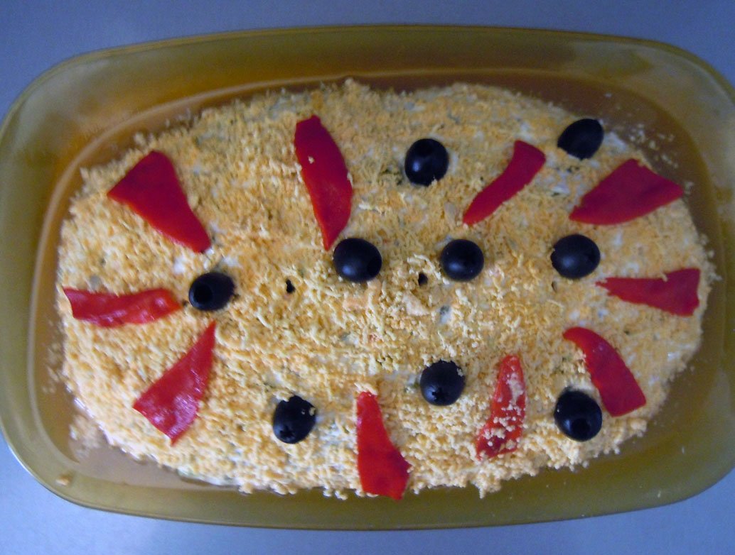 Para decorar se ralla la clara de huevo por encima y se añaden unas tiras de pimiento.